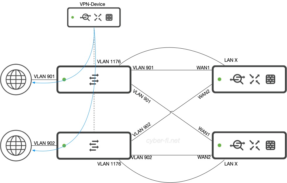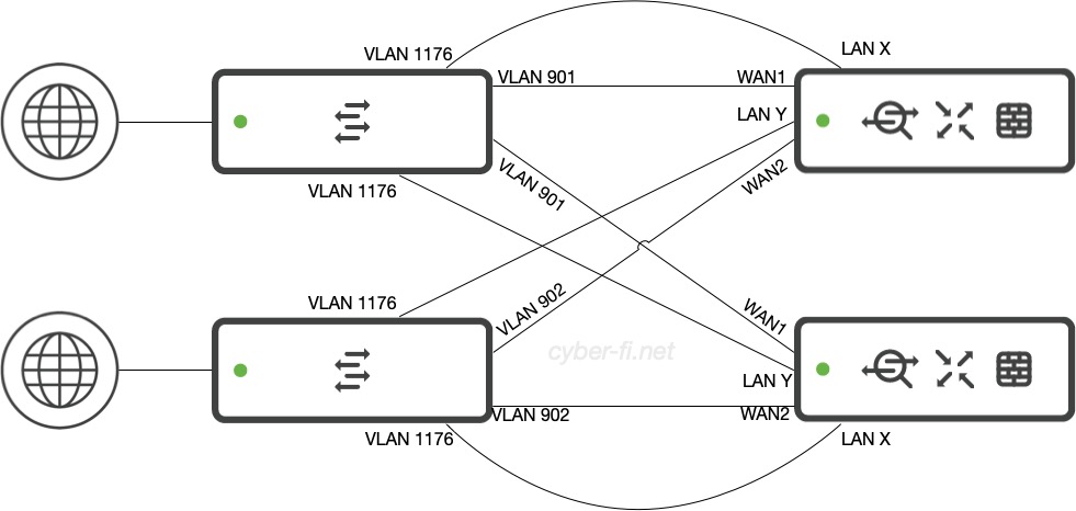 With this setup, the firewall connected to WAN-switch one needs to be able to reach the ISP router connected to WAN-switch 2. And this is also done through the cross-link: